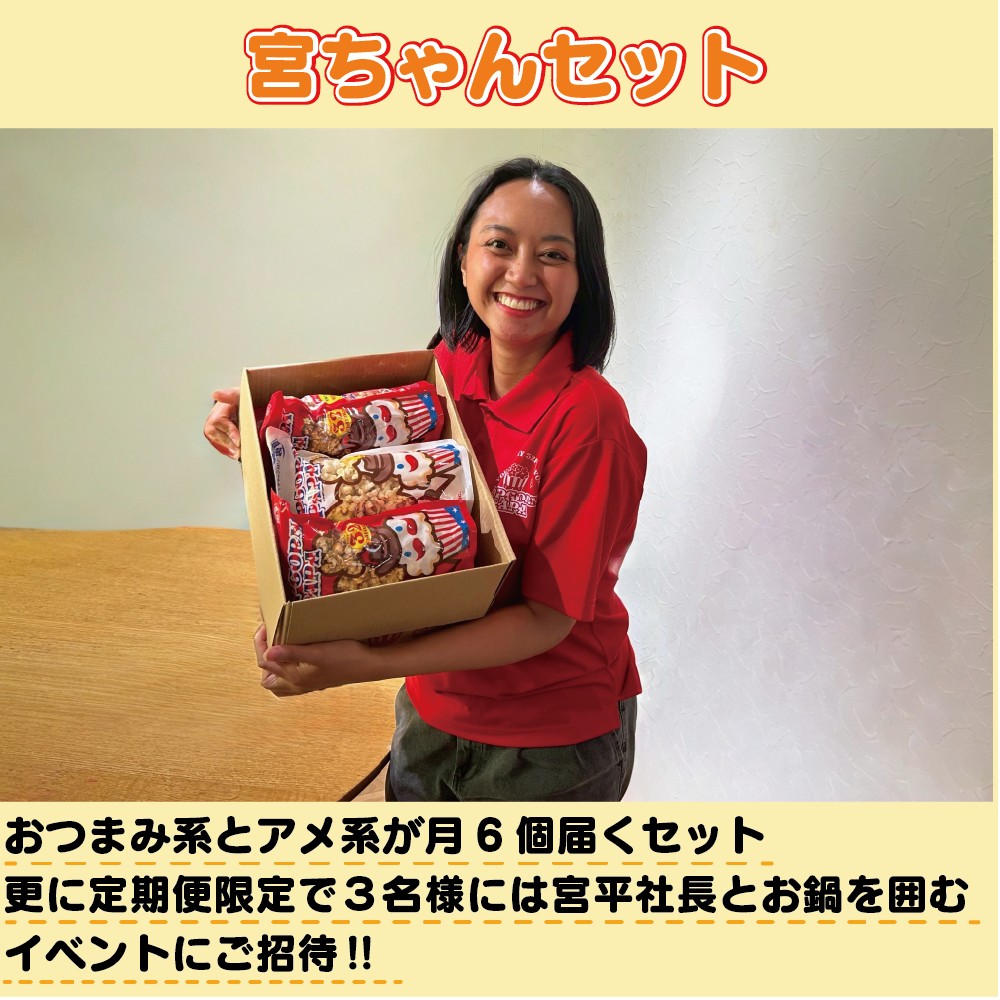 おつまみ系・あまい系どちらも,通常ご注文 宮ちゃんセット(アメ系3個おつまみ系3個) 3,500POP おつまみ系・あまい系どちらも,通常ご注文 宮ちゃんセット(アメ系3個おつまみ系3個) 3,500POP ペロリと食べきれるちょうどいい量! ●商品内容:月にアメ系3個おつまみ系3個 ●内容量:1袋1.2ℓ ●賞味期限:アメ系105日~120日間おつまみ系45日~60日間 宮ちゃんセット(アメ系3個おつまみ系3個)個 カートに入れる 在庫切れ お気に入りに追加する お気に入りに追加済み 説明 ちょこっとサイズで気軽に! おつまみ系とアメ系が3個ずつ、合計6個のお試しセット。 「まずは少なめで食べてみたい」という方にぴったりです。 何が届くかは開けてからのお楽しみ♪ 気に入ったら、毎月の定期便(鍋イベント付き!)へどうぞ。 レビュー コメントをキャンセルレビューを投稿するには、会員登録が必要です。